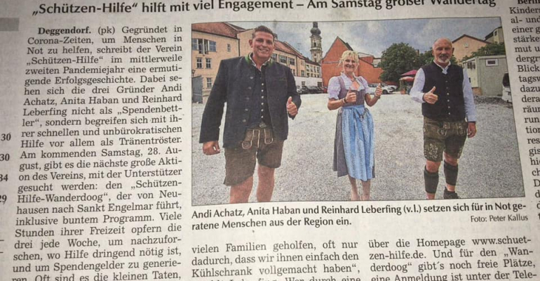 Menschen aus der Region, denen es nicht so gut geht, zu unterstützen – das hat sich der Verein „Schützenhilfe“ als Ziel gesetzt. Seit gut einem Jahr gibt es den Verein, und er hat sich als Erfolgsgeschichte entwickelt. Nun steht die nächste große Aktion an, bei der man hofft, Unterstützer zu finden: Der „Schützenhilfe-Wanderdoog“ am kommenden Samstag, 28. August, von Neuhausen nach Sankt Englmar.